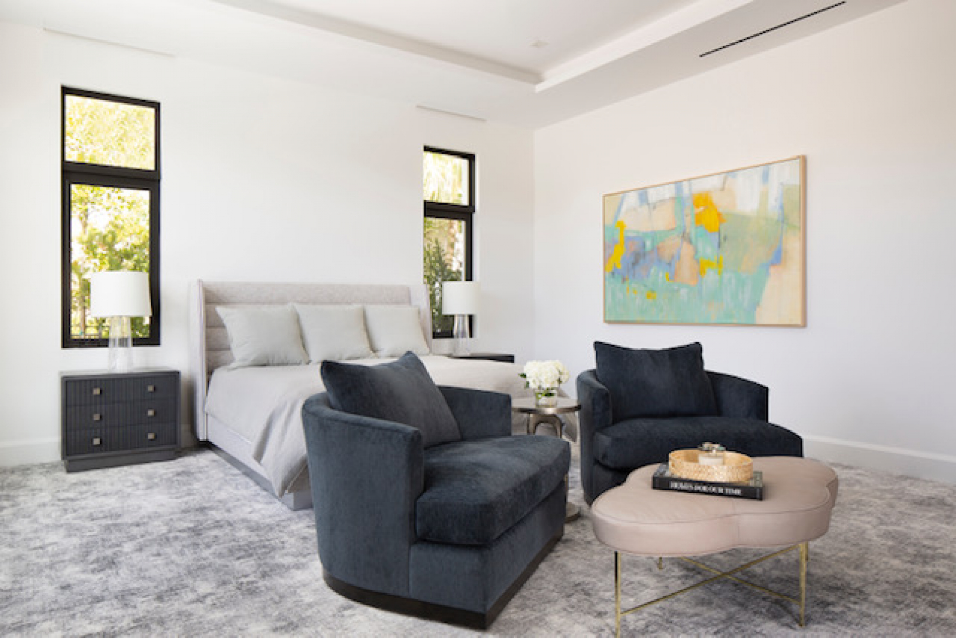 Different elements can bring things together, from the abstract carpet to the sofa accent barrel chairs and the splash of color added with the painting, you have a sense of wholeness.